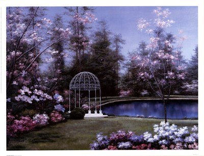 Title: Lakeside Gazebo. Artist: Diane Romanello. Image Size: 15.96in. x 12.01in. Paper Size: 17.00in. x 13.00in. MUSEUM WRAP CANVAS Print With Added Heavy BRUSHSTROKES